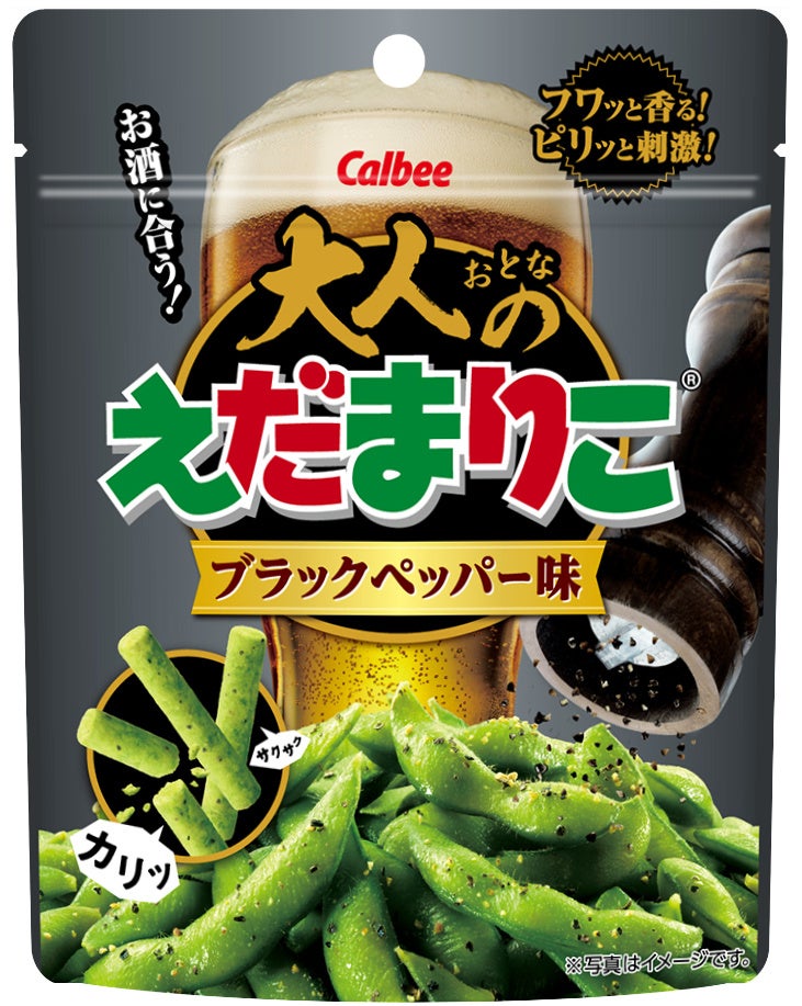 「大人のえだまりこ」は、お酒のおつまみとして人気が高い枝豆本来の味わいを「じゃがりこ」の食感で、大人好みの味、お酒に合う味わいに仕上げた枝豆スティックです。ブラックペッパー味の「えだまりこ」は、2020年に期間限定で発売し、「ピリ辛がアクセントになって、お酒にピッタリ」と高い評価をいただきました。『大人のえだまりこ ブラックペッパー味』は、前回商品よりもブラックペッパーの風味を約2倍にアップ。粒度の異なる2種類のブラックペッパーを使用して、口に入れた瞬間に粒度の細かいブラックペッパーがフワッと広がり、噛むほどに粒度の粗いブラックペッパーがピリッと感じる奥深い味わいに仕上げました。