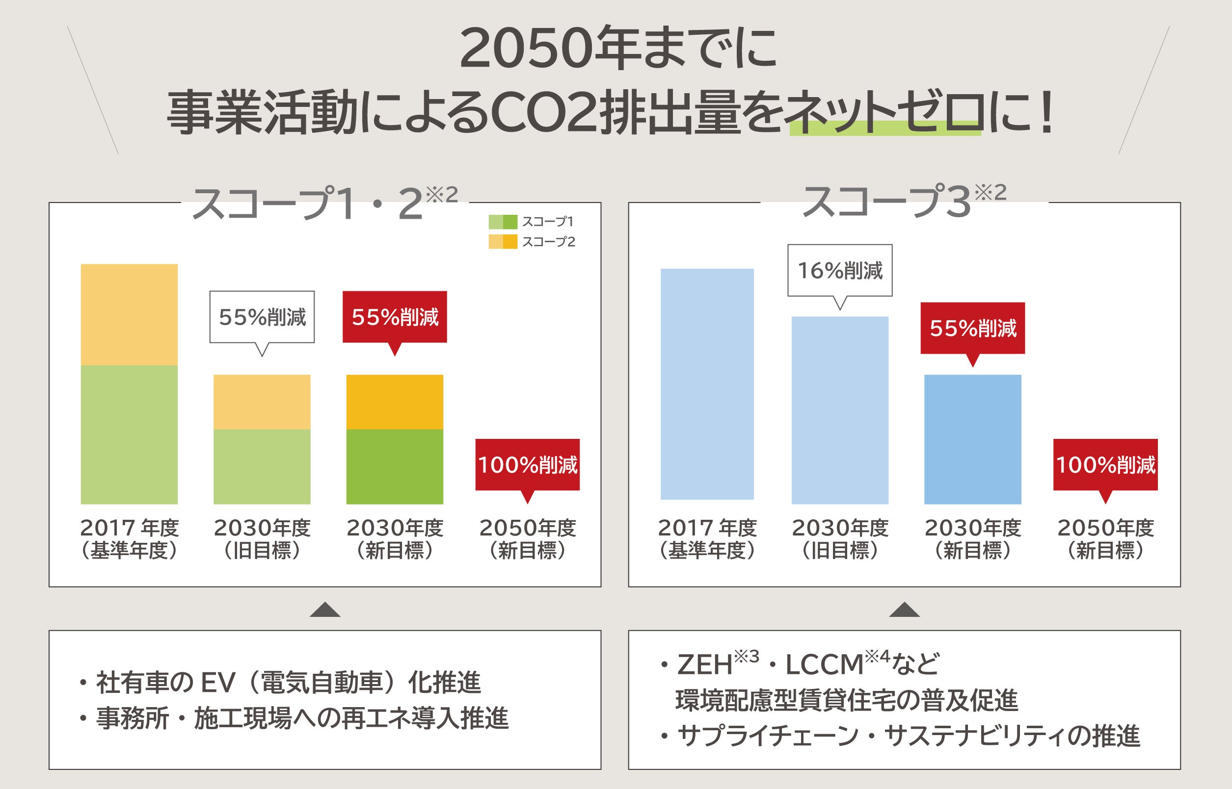 当社グループは、今後も社有車のEV化や環境配慮型住宅の普及促進などの推進により、バリューチェーン全体の温室効果ガス排出量を2050年までに実質ゼロにすることを目指します。