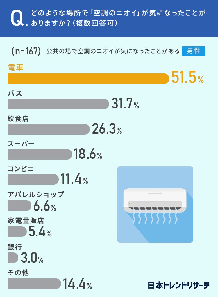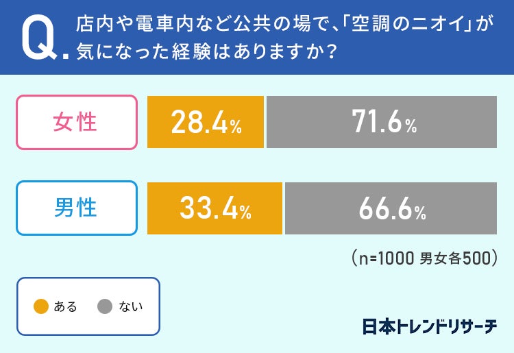 女性の28.4%、男性の33.4%が、店内や電車内など公共の場で、「空調のニオイ」が気になった経験が「ある」と回答しています。