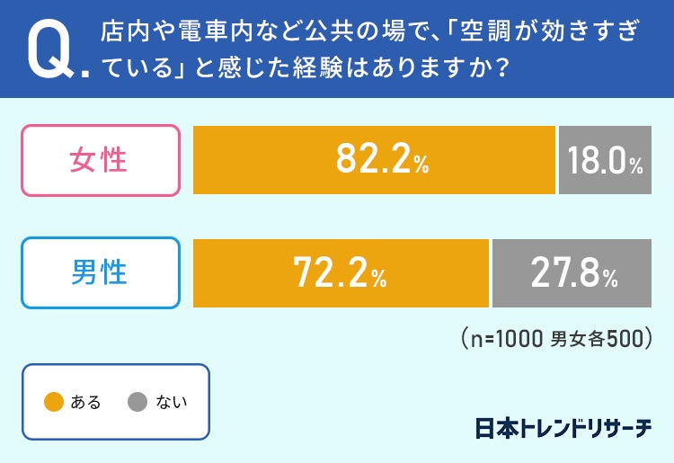 女性の82.0%、男性の72.2%が、店内や電車内など公共の場で、空調が効きすぎていると感じた経験が「ある」と回答しています。
