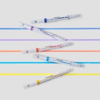ラインマーキングと細かな文字書きが1本でできる2WAY仕様のマーカーセットです。朝から夜にかけての時間のうつろいによって変わる「空の色」にインスピレーションを受けた情緒的なカラーを5色セットにしました。