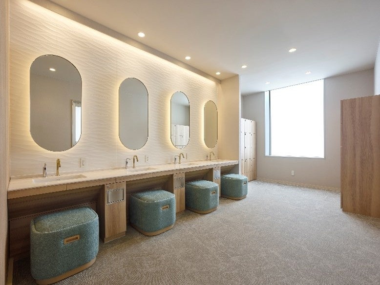 混雑を避け、ゆったりとご利用いただけるように、女性用大浴場では浴室内の洗い場を計8箇所(カラン7箇所・シャワーブース1箇所)に増設いたしました。また、女性用パウダールームを拡張し、ゆとりあるスペースを確保。リニューアル前からご好評いただいている「お好みのシャンプー・トリートメントをお選びいただけるコーナー」も引き続きご用意しております。