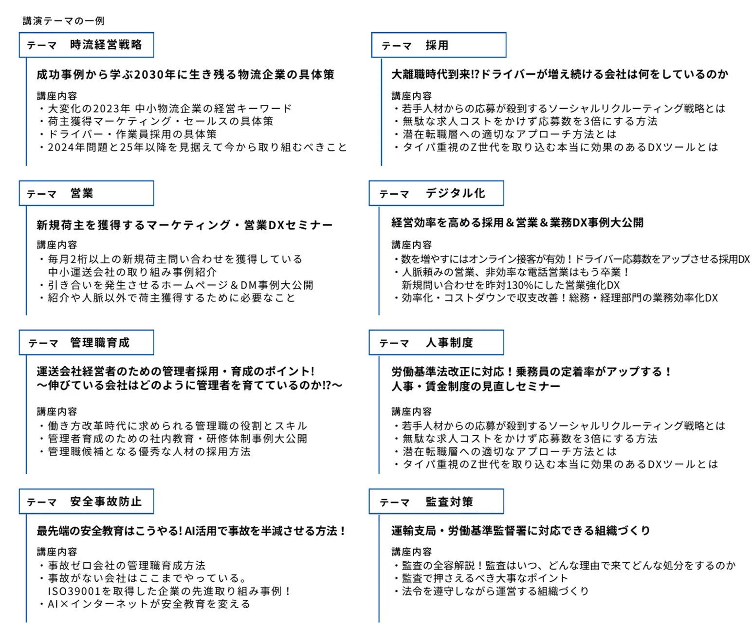 船井総研ロジの「運送会社・物流会社向け 協業セミナー」では、人材採用、業界動向、働き方改革、安全研修など、幅広いテーマに対応しており、専門コンサルタントが、実践から生まれたノウハウをお伝えします。