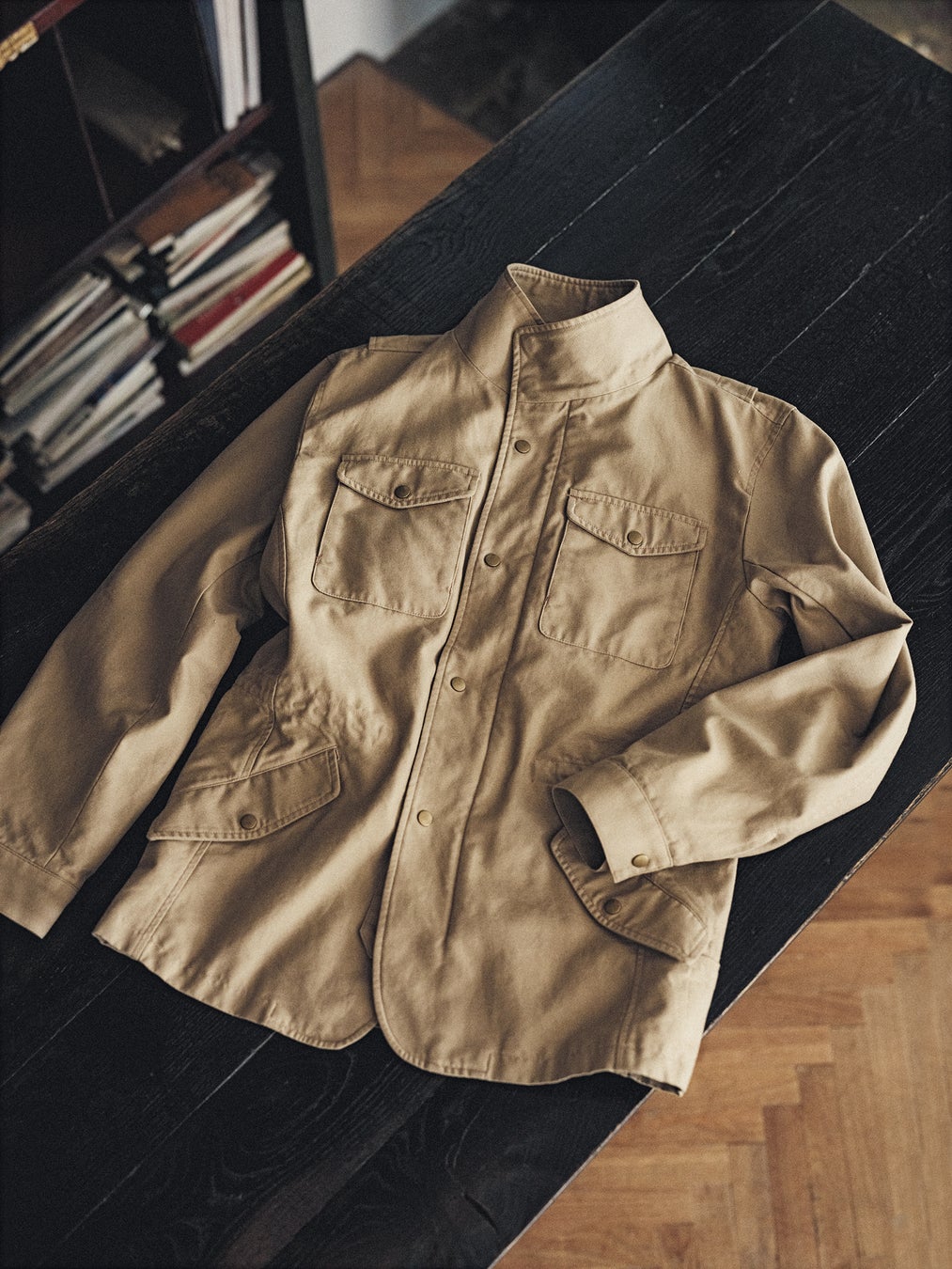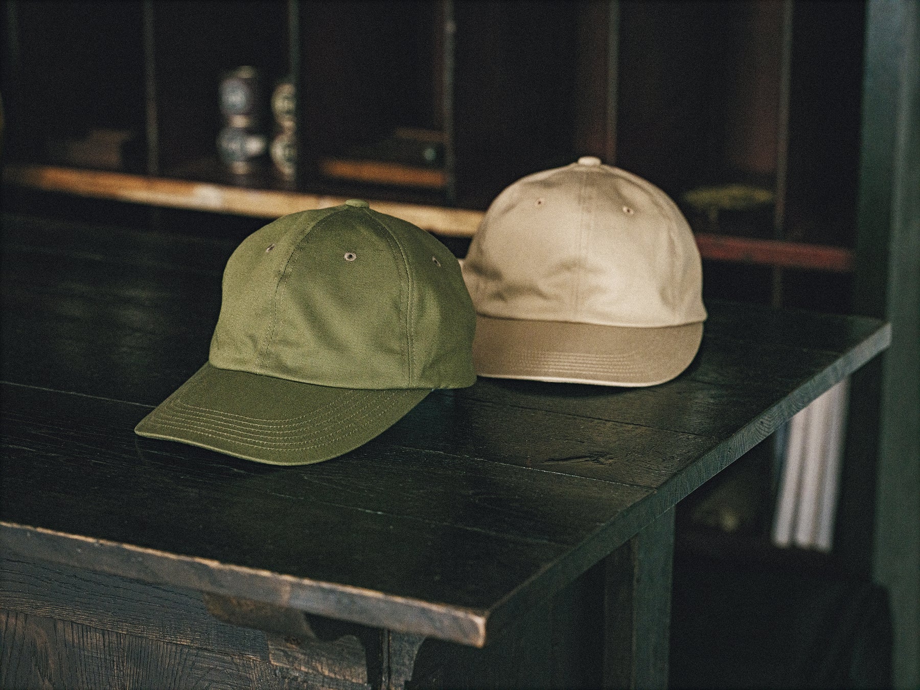 廃棄される茶葉を再利用し、たんぱく質で植物の色素を定着させる「ボタニカルダイ」で製品染めした別注アイテム。ブランド初期に生産していたジャケットの型紙をリデザインし、ミリタリーウェアの経年変化をボタニカルダイの後染めで表現することで、「大人のミリタリーウェア」を開発。細身のシルエットにアレンジしたM-65ジャケットとシンプルで活用度の高いキャップを、グリーンとベージュの2色に染め上げました。