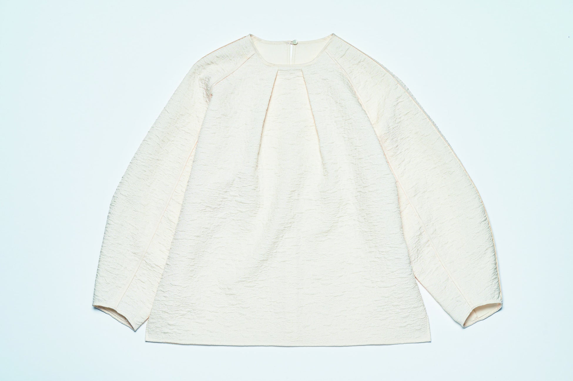 BRING Material™(再生ポリエステル)(※)を使用した、ふくれジャカード生地を使った華やかなブラウス。立体感がありながらも、パイピング使いで膨張しすぎず、程よく締まった印象に。