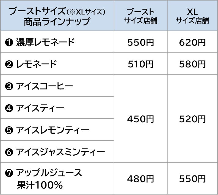 ブーストサイズ店舗 550円(税込) / XLサイズ店舗 620円(税込)