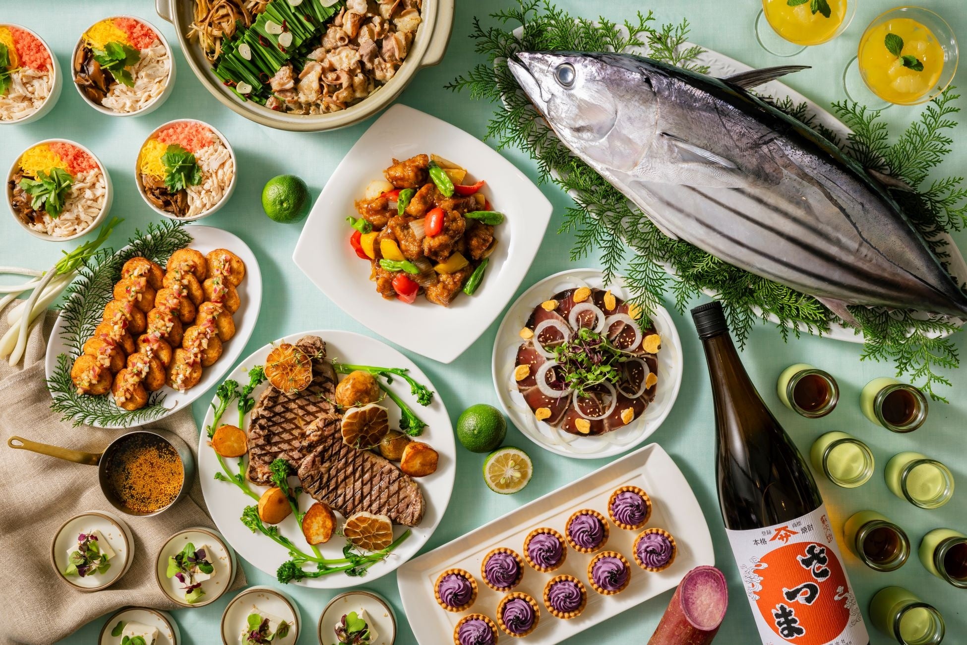 今回の「旅するブッフェ」では、九州各地の郷土料理や名産品を活かした多彩な料理が勢ぞろい。宮崎名物「チキン南蛮」や鹿児島名物「鶏飯」などの定番グルメはもちろん、昨年のブッフェでご好評だった酢豚をカボスの風味でさらに進化させた「カボ酢豚」、焼酎と相性抜群の、甘らっきょうとピリッとした辛さがアクセントの赤玉ねぎを組み合わせたソースをかけて楽しむ「薩摩揚げ 九州産エシャレットソース」も登場!さらに、お客さまご自身で茹でていただくことで、出来立てを楽しめる「長崎ちゃんぽん(ランチのみ)」やディナー限定で登場する「福岡名物 もつ鍋」などもご用意します。