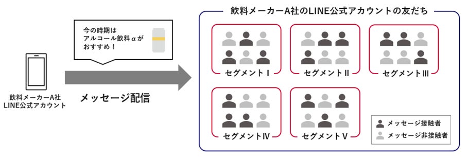飲料メーカーA社のアルコール飲料αのプロモーションにおいて、本サービスをご活用いただきました。A社のLINE公式アカウントの友だちをⅠ~Ⅴの5つのセグメントに分け、それぞれに対してメッセージを配信しました。その後、配信効果をPontaの購買データを用いて分析しました。