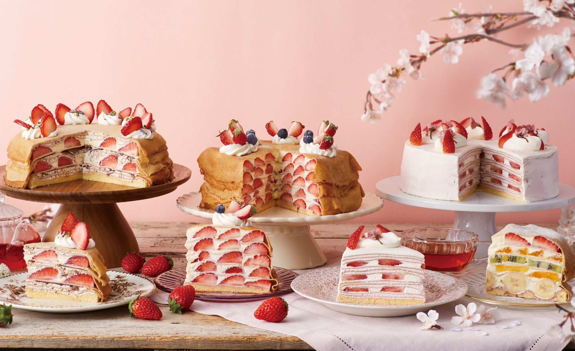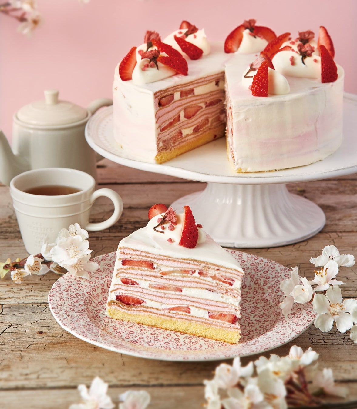 【Afternoon Tea LOVE&TABLE】ふんわり桜が香る「さくらストロベリーのミルクレープ」や、真っ赤な“あまおう苺”のスペシャルミルクレープが登場