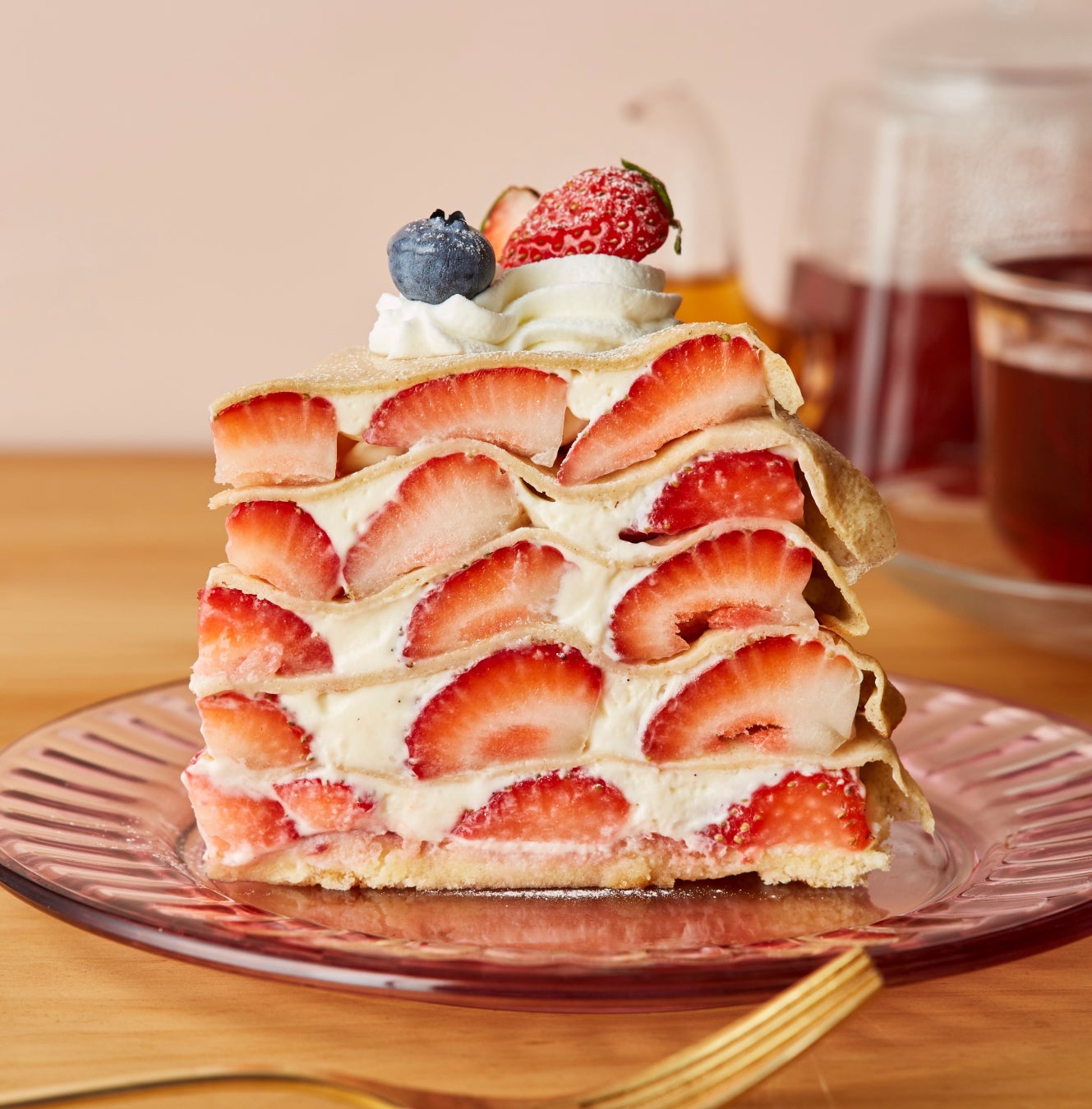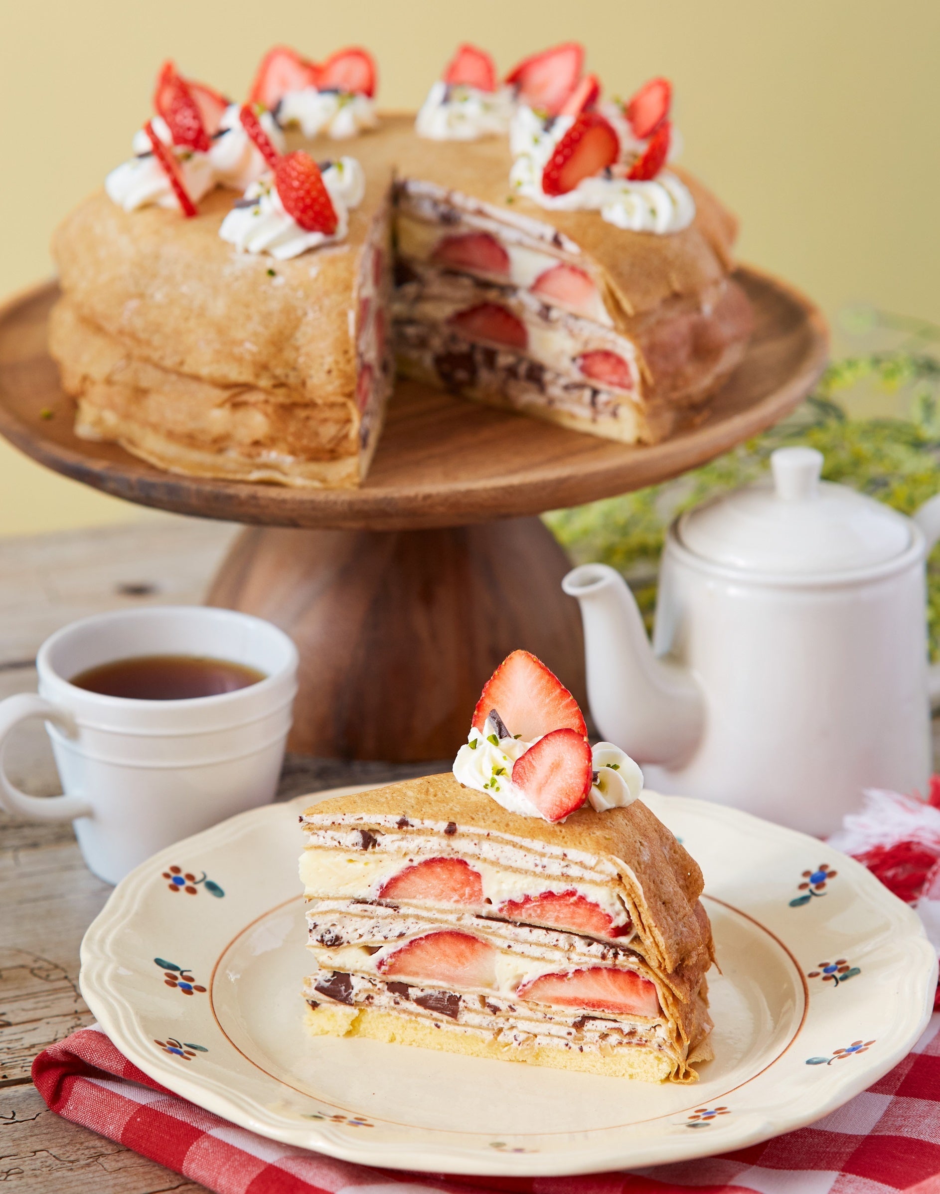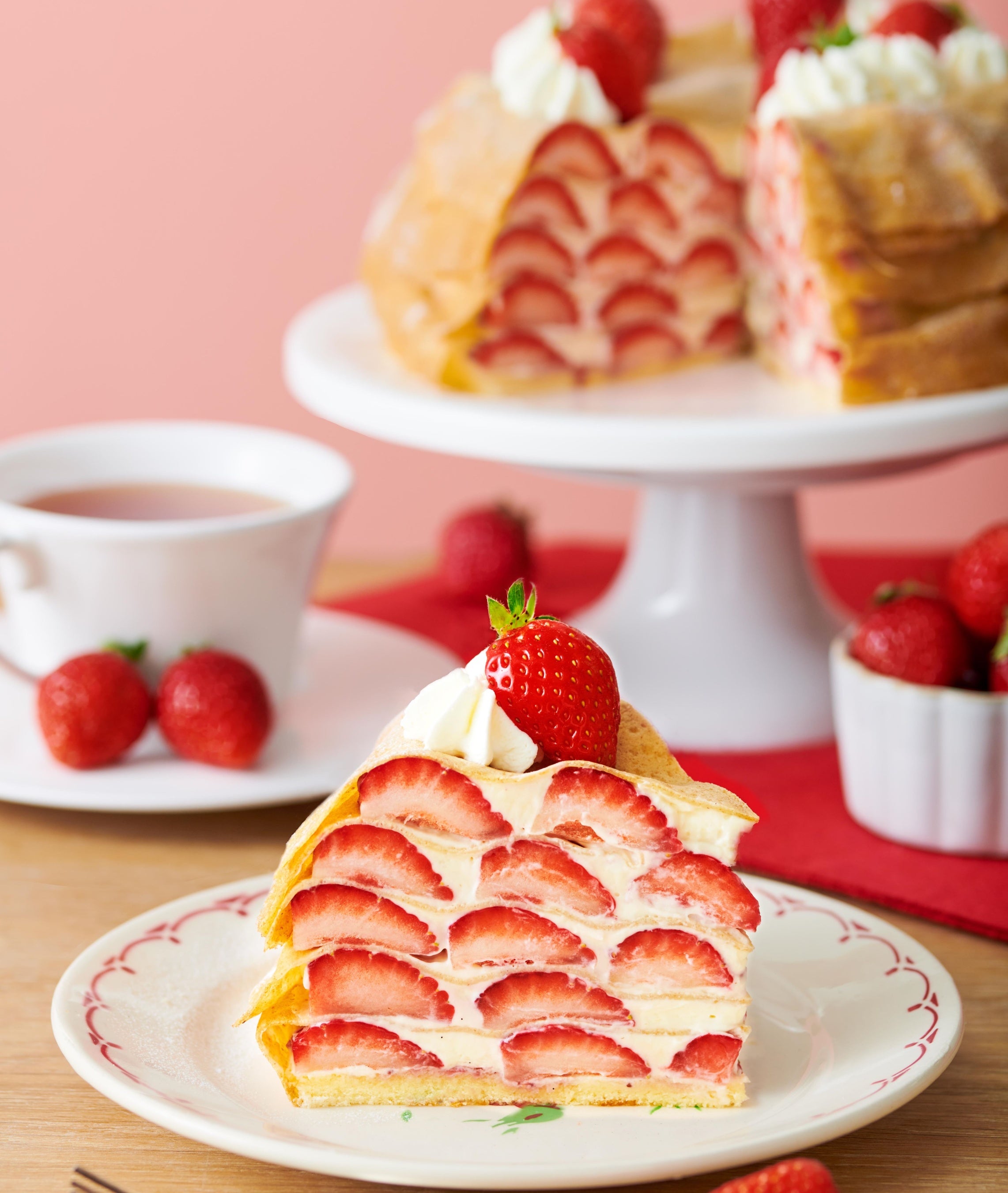 旬の苺をふんだんに使用し、ディプロマットクリームともちもち食感のクレープで5層に重ねました。