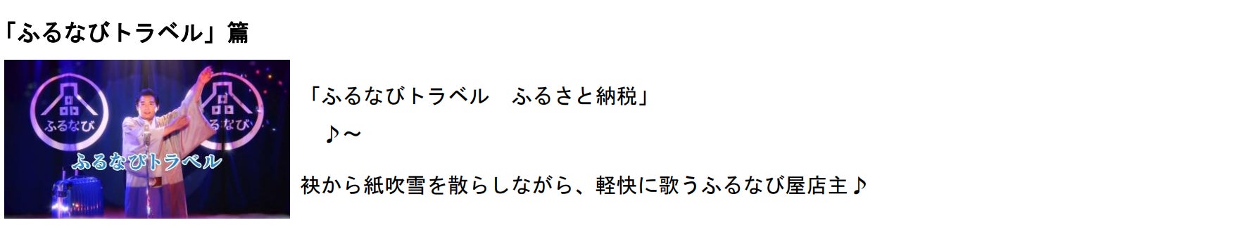 本作品では、ふるなび屋の店主役を演じる貴乃花さんが、お馴染みの歌にのせて“ふるなびのお得なキャンペーン”や“ふるなびトラベルの魅力”を紹介しています。