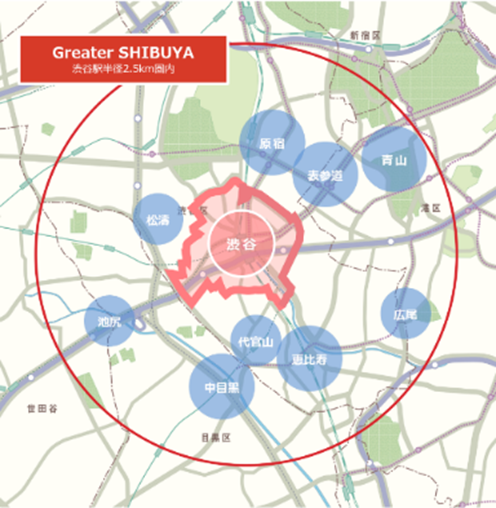 「広域渋谷圏(Greater SHIBUYA)」とは、東急グループの渋谷まちづくり戦略において定めた、渋谷駅半径2.5kmのエリアのことを指します。
