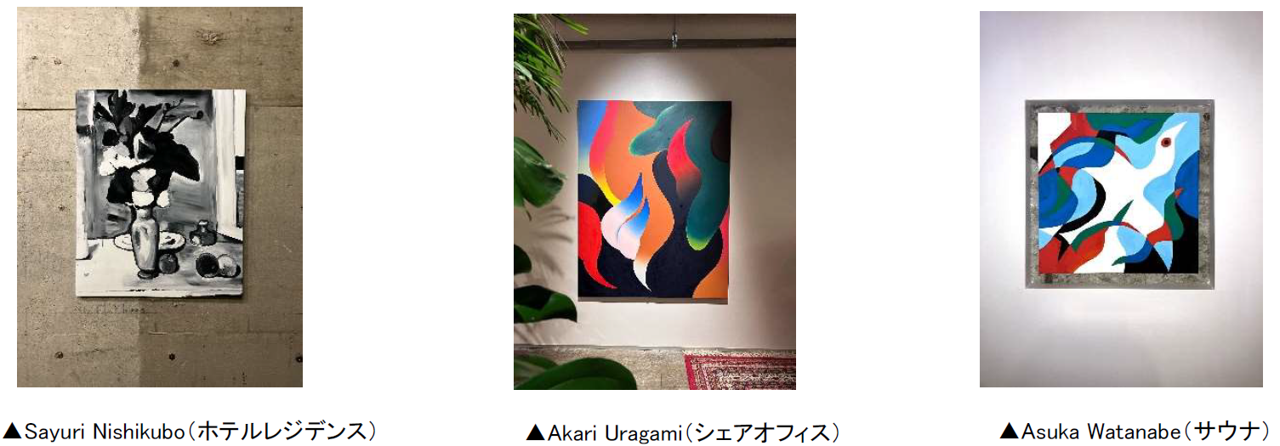 2~5階のシェアオフィス、ホテルレジデンス、プライベートサウナにて、3名のアーティストによる作品の展示を行います。それぞれの空間の魅力を最大限に引き出す作品群は定期的に入れ替わり、施設利用者や来館者の体験価値向上を目指します。なお、展示されているすべての作品は、どなたでも購入が可能です。第一回の作品展示は以下のアーティストの作品となります。