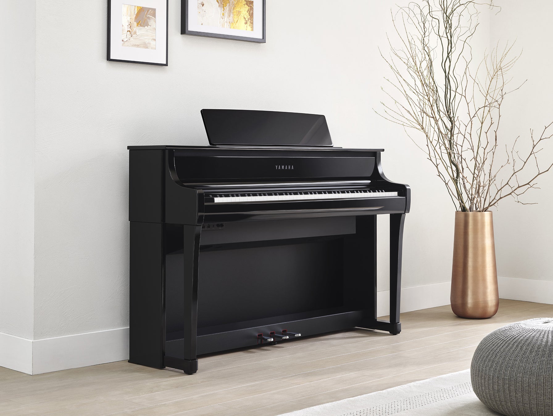 ピアノの演奏体験と楽器のデザインの関係性も深く考慮し、楽器としての温かみや大らかさを感じられるよう、デザインを一新しました。腕木など各所パーツにグランドピアノを感じさせるゆるやかな曲線を取り入れたほか、『CLP-875/845』ではグランドピアノと同じ横幅の譜面板を備えました。これにより、奏者はグランドピアノの前に座った時に近い感覚で演奏に没入できます。