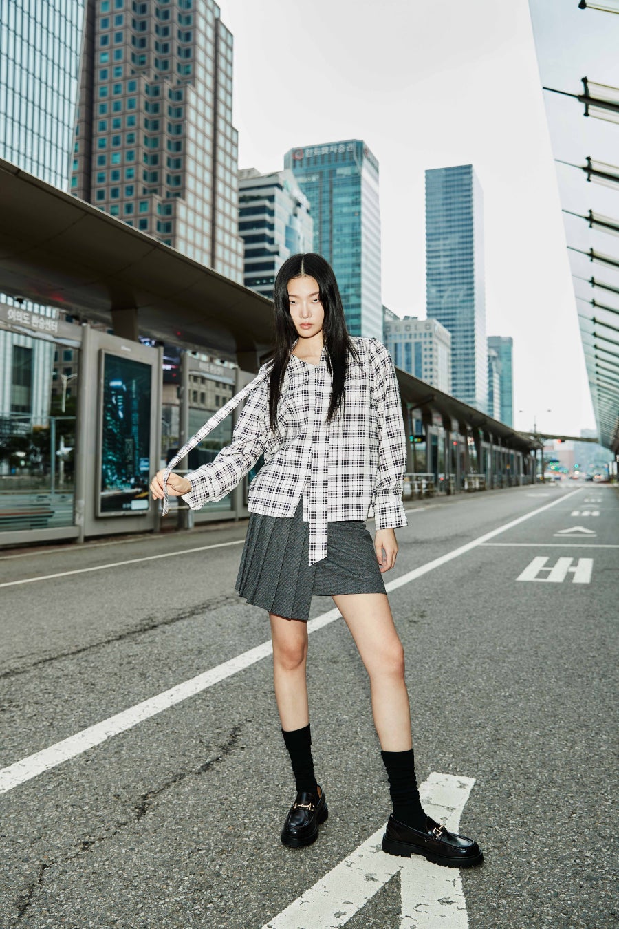 今シーズンの必須アイテムであるオーバーサイズのレザー調コーティングジャケットは、晩秋まで着用できます。アシンメトリーなプリーツスカートは、レイヤードスタイルでトレンドのプレッピールックを演出できるアイテムです。