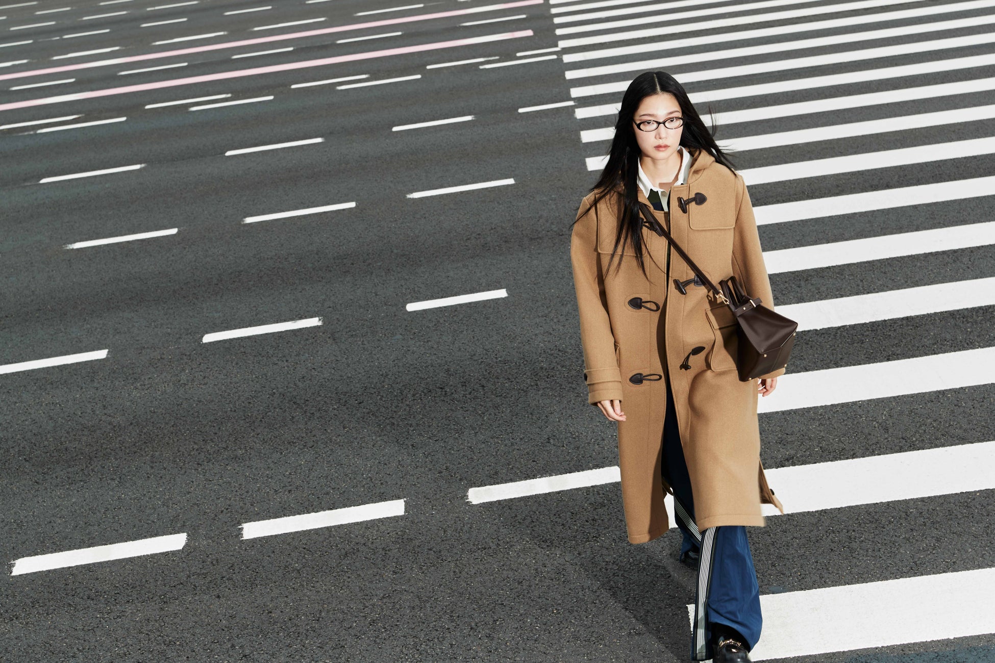 花柄刺繍のエンボスカーディガンとチェック柄のキャミワンピースをレイヤードしたスタイリングは、90年代のグランジスタイル連想させます。その上に、軽くて防寒性の高いクラシックなヘリテージ・ダッフルコートを羽織ることで、初冬まで着こなすことができます。