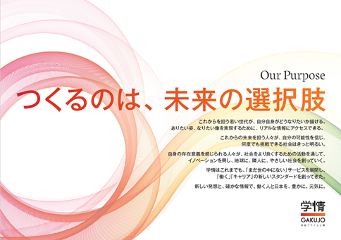株式会社学情(本社:東京都千代田区)は、存在意義や目指す未来を明文化し「パーパス」を制定しました。パーパス「つくるのは、未来の選択肢」のもと、若い世代に1つでも多くの選択肢を示すことで、これからを担う世代と、企業、ひいては社会の未来に貢献してまいります。