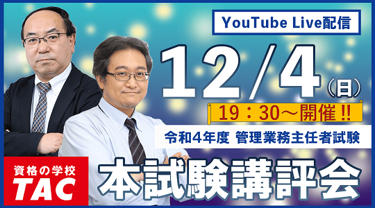 公認会計士や税理士など、数多くの国家資格や検定試験の受験指導といった教育事業を展開しているTAC株式会社(東京都千代田区、代表取締役:多田敏男)は、12/4(日)に実施される『令和4年度 管理業務主任者試験』の解答速報を試験当日にTACのWebサイトで公開いたします。さらに、当日には『本試験講評会』も開催し、その模様をなんとLIVE配信いたします!スマートフォン・タブレット端末からもご視聴いただけますので、 ぜひ奮ってご覧ください!