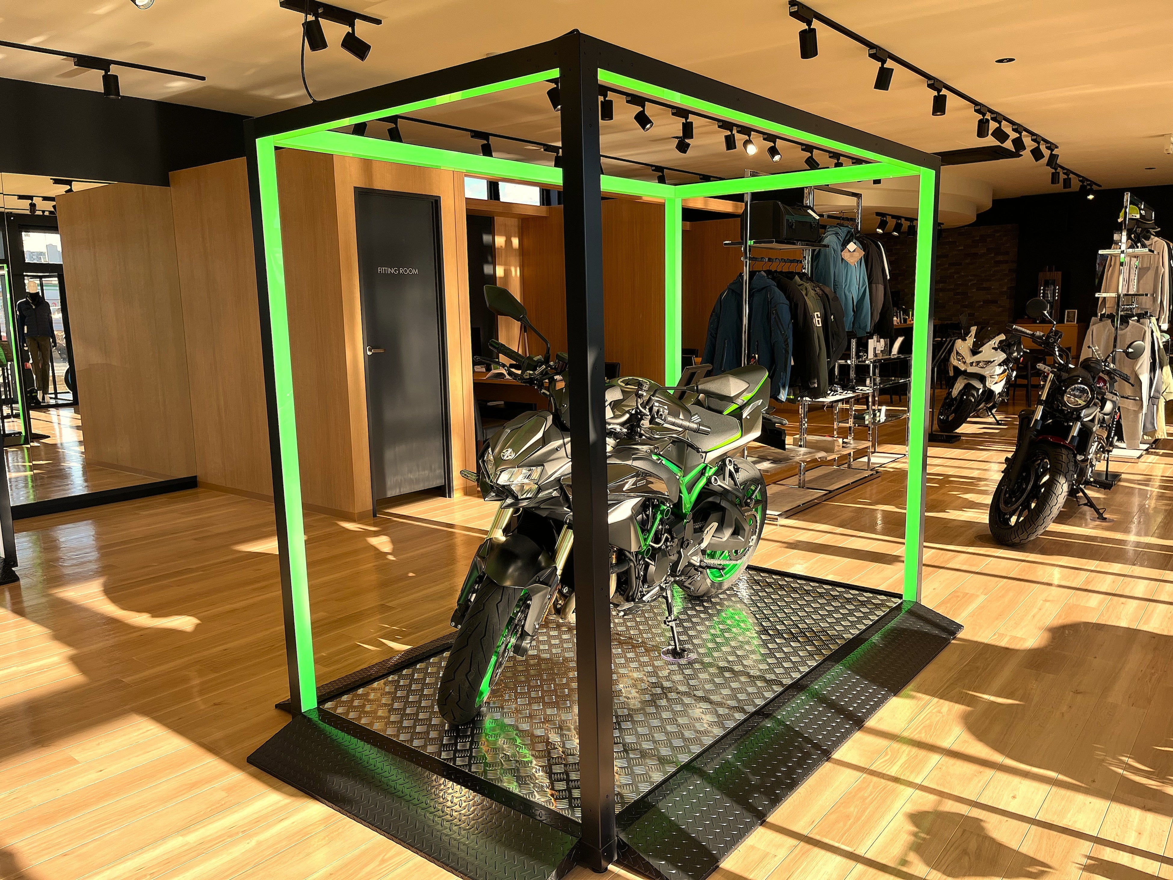 新たなオーナーを待つモーターサイクルたちが、ケージの中で静かに眠りについているイメージを光の枠で創出。カワサキプラザならではのアイコニックポイントの一つです。