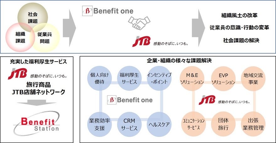 株式会社ベネフィット・ワン(本社:東京都千代田区、代表取締役社長 白石徳生、以下、ベネフィット・ワン)と株式会社JTB (本社:東京都品川区、代表取締役 社長執行役員 山北栄二郎、以下、JTB)は、2021年8月に締結した事業提携契約に基づき、相互のサービス・顧客ネットワークを活かした協業を4月1日(金)より開始いたします。