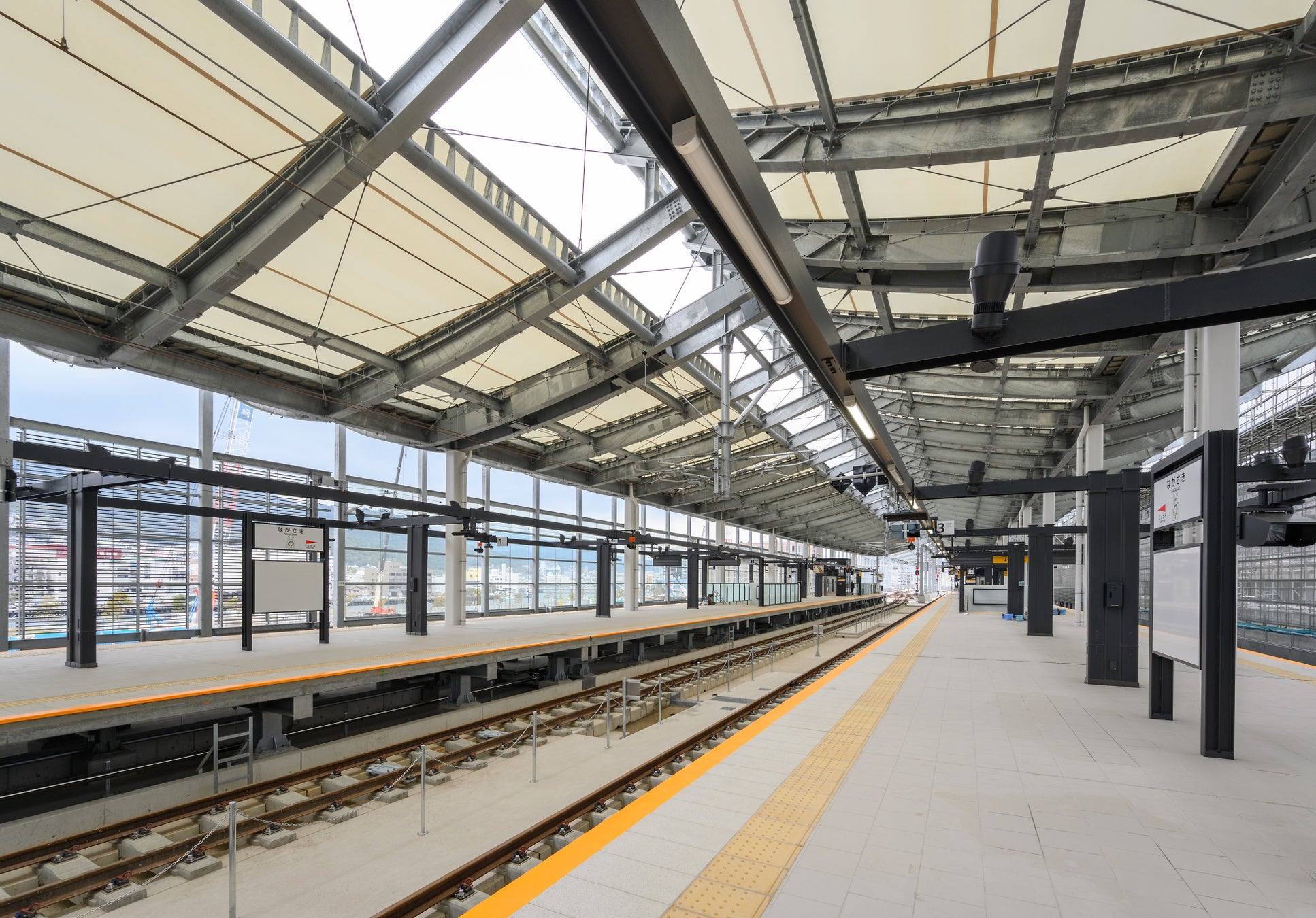 長崎駅は、新幹線と在来線が並列する日本唯一の頭端駅であり、海に開かれた駅としては世界にも類を見ない特徴を有しています。在来線長崎駅は、長崎県工芸品の波佐見焼陶板やハルデスレンガをイメージしたタイルを使用し、コンセプトである「長崎らしさ」を体現しました。プラットホーム上家の屋根形状は「海」や「帆」を連想させる流線形となっており、膜屋根を採用することで明るい空間を生み出しています。光を透過する膜屋根はホーム上の照明により「世界新三大夜景」の一役を担っています。なお、長崎駅や駅周辺のデザインは、県・市と専門家で組織された「長崎駅舎・駅前広場等デザイン検討会議」での議論を踏まえて策定されたデザイン基本計画に基づいています。