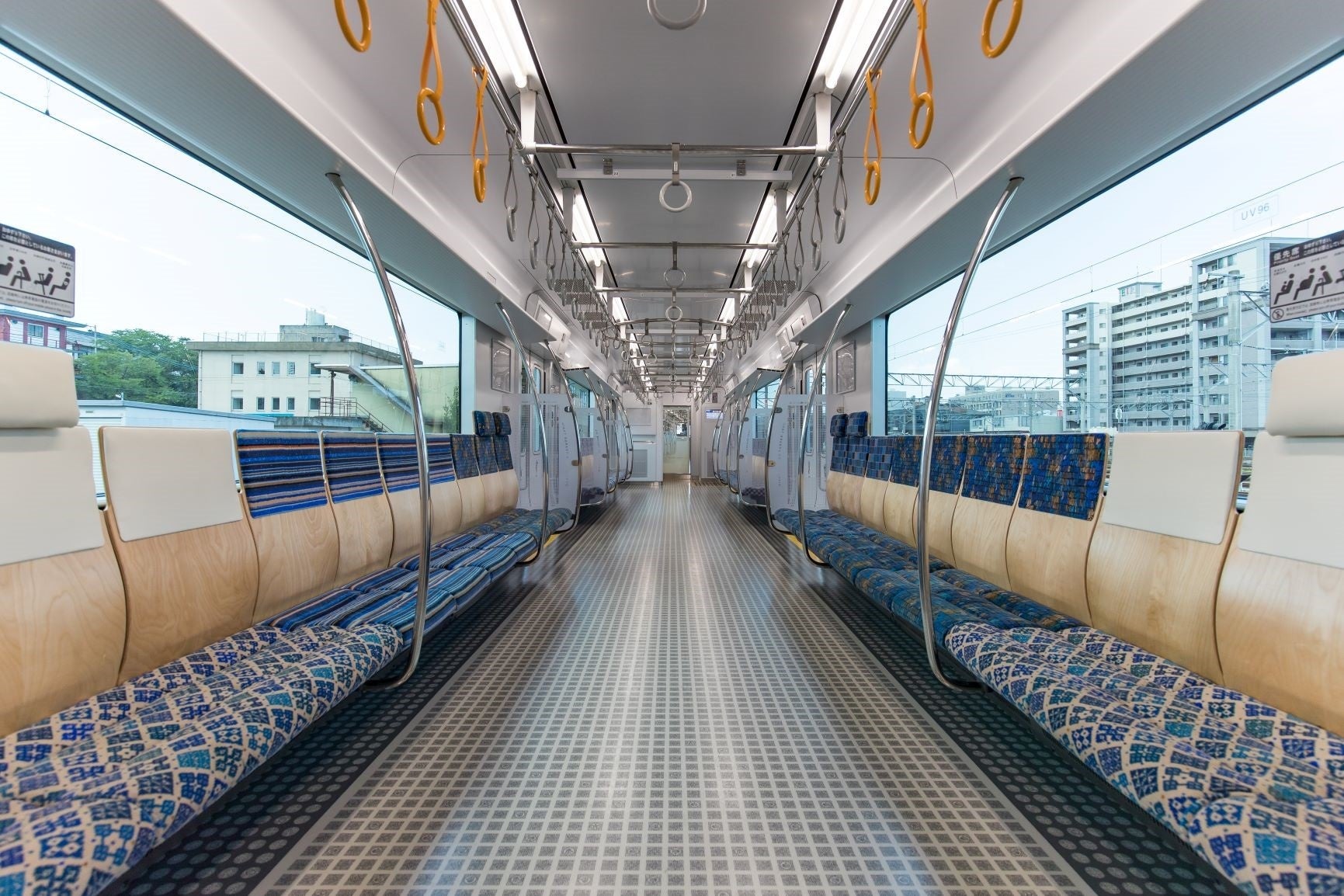 BEC819系「DENCHA」は、「人と地球の未来にやさしい次世代型車両」というコンセプトのもと開発された電車です。蓄電池に蓄えた電気エネルギーで架線の無い非電化区間を走行します。白い車体には「地球」をイメージした青色が配色され、電池をモチーフにしたロゴマークがあしらわれています。客室内の座席には木材とモダンな柄のファブリックが使用され、座席の両端には伝統工芸「組子」をモチーフにしたデザインの仕切り壁が取り付けられています。