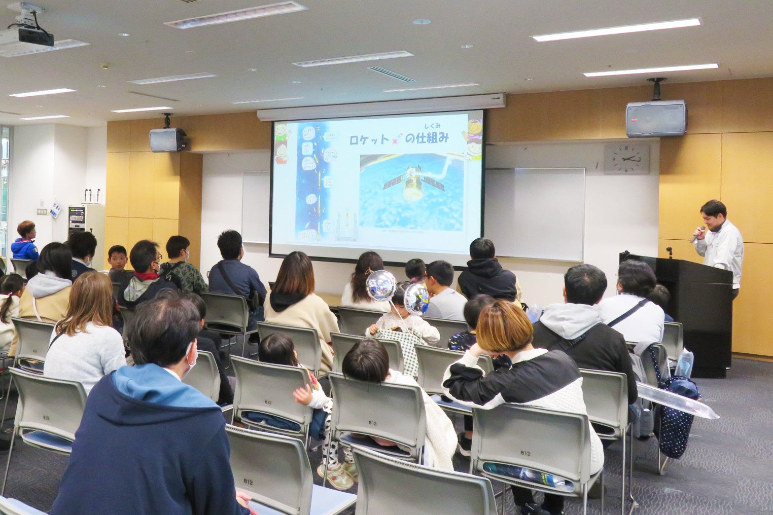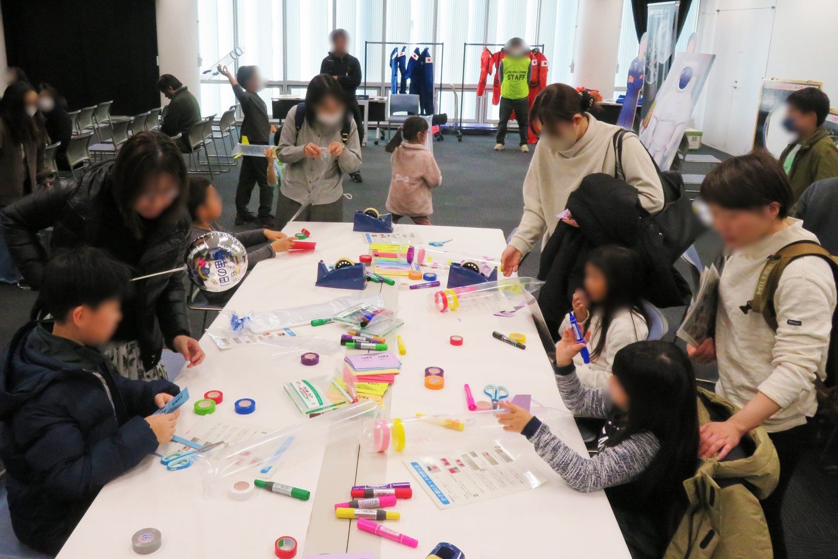 【内容】「ミニ宇宙講座」に参加いただいたあと、「ペットボトルロケットワークショップ」でロケットを作り、中庭で実際に飛ばしていただきます。「宇宙服試着コーナー」は先着順でご案内します。