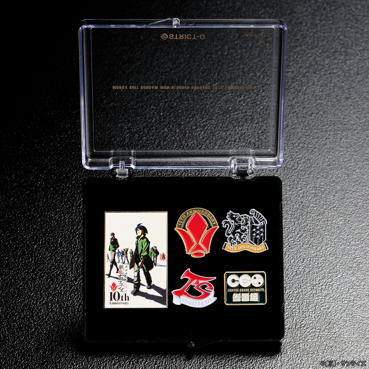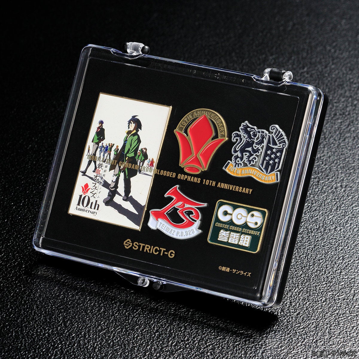 『機動戦士ガンダム 鉄血のオルフェンズ』10周年を記念し、ピンズセットが登場!10周年を記念した、キービジュアルと、鉄華団、ギャラルホルン、テイワズ、CGS参番組の各ロゴマーク、計5種のピンズが特製ケースに入った、限定感の有る仕上がりが魅力のセットです。