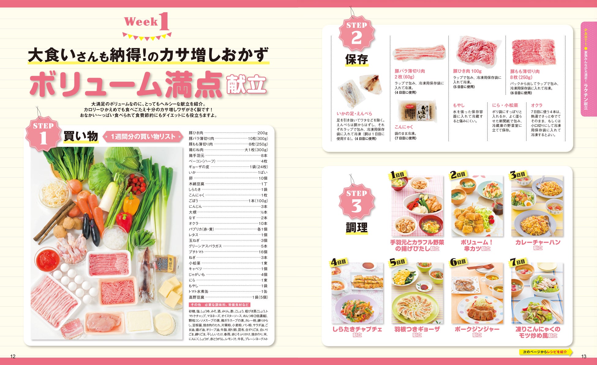 そして、大食いさんも納得のカサ増しおかずを組み合わせたボリューム満点献立も紹介。大満足のボリュームなのに、とってもヘルシーな献立を紹介。カロリー控えめでも食べごたえが十分のカサ増しワザがさく裂です。おなかいっぱい食べられて食費節約にもダイエットにも役立ちます。
