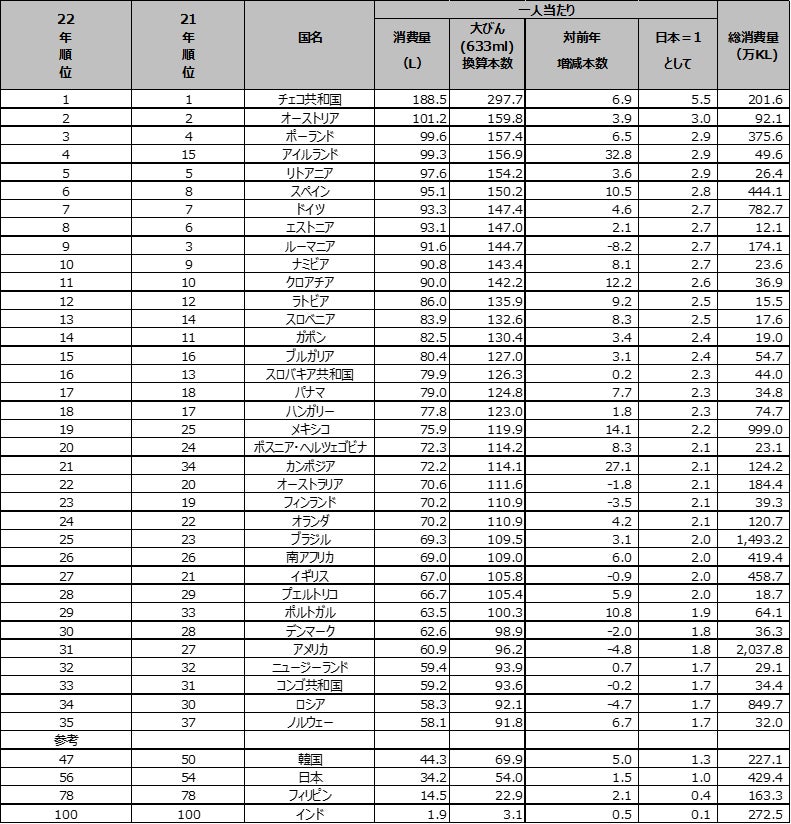(表1) 2022年 国別ビール消費量