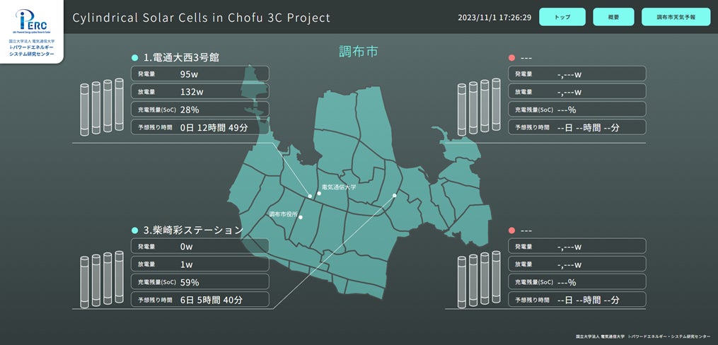 電力を見える化するモニタリングダッシュボード(図4)を開発しました。今後,市内各地に設置予定の円筒形太陽電池の発電量と蓄電池の状況をインターネット上に可視化していきます。