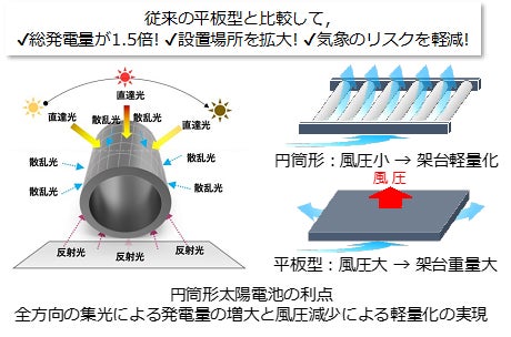 ・円筒形太陽電池は,電気通信大学i-パワードエネルギーシステム研究センターの早瀬修二特任教授が,ウシオ電機株式会社,株式会社フジコー, CKD株式会社との共同研究で研究開発を進めてきた技術です。