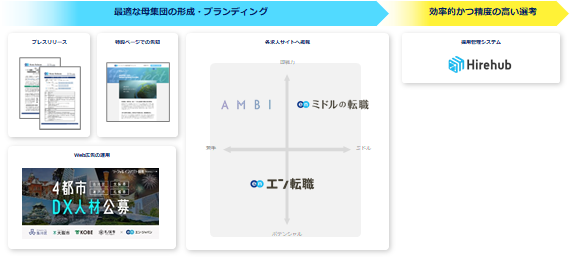 プレスリリースや特設ページ、Web広告での告知に加え、各求人サイトでの集客支援を実施。『エン転職』『AMBI』『ミドルの転職』とターゲットの異なる3つの求人サイトを活用することで、ターゲットへ網羅的に求人をお届け。さらに採用管理システム『Hirehub』の提供により、選考フローを支援。求職者との適切なマッチングを実施しました。