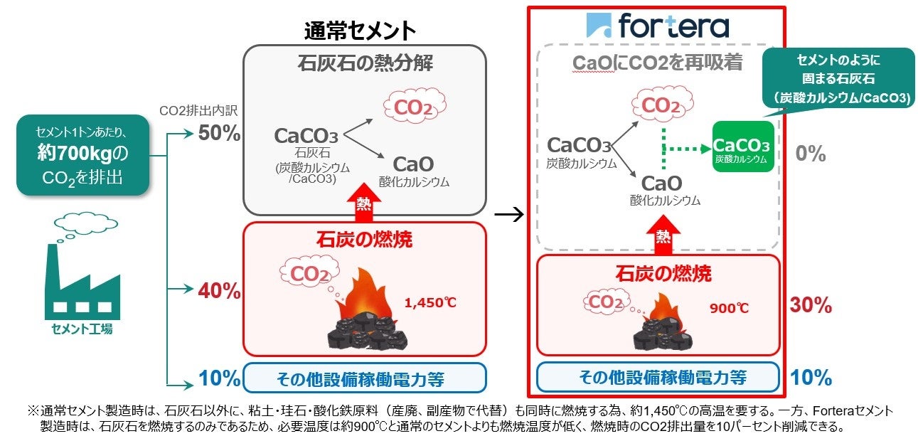 Fortera社は、セメント製造時に発生するCO2を酸化カルシウムに吸着し直すことで、熱分解前とは異なる粒状の炭酸カルシウムを製造する技術を有しています。CO2を再吸着すること等によって、セメント製造時のCO2排出量を60パーセント削減した低炭素セメントの製造が可能になります。さらに、熱源に再生可能エネルギーを使用できれば、熱分解によるCO2削減とあわせて、製造時に発生するCO2を100パーセント削減したカーボンフリーセメントの製造が可能になります。