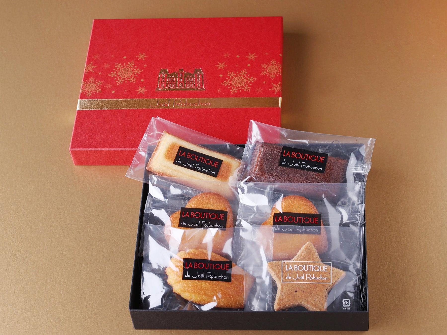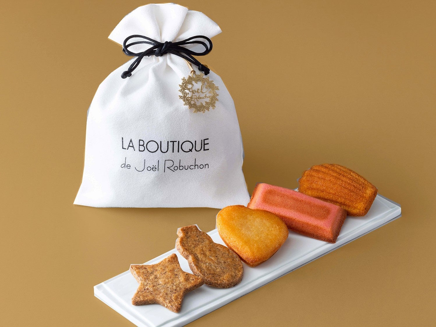 <特徴>ジョエル・ロブションのロゴが入ったオリジナルの巾着に、クリスマスらしい雪だるまと星形のクッキーが入った、かわいらしい限定アソートメントです。