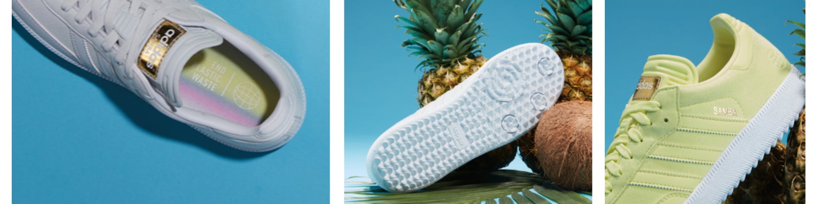 SAMBA GOLF Limited Editionは、アイコニックなシルエットはそのままに、ゴルファーのベストなプレーを引き出すのに十分な機能を備えています。アディダスが掲げるサステナビリティへのコミットメント「END PLASTIC WASTE」に向けて、撥水性と耐久性が高く、スウェードのような質感の機能性リサイクル素材を採用しました。また、EVA素材のクッショニングによって、快適性と安定感を補強しています。アウトソールは、前足部は吸盤のような仕組みのSAMBAに倣いながら、ゴルフに必要なグリップ力や安定感をもたらす構造としています。