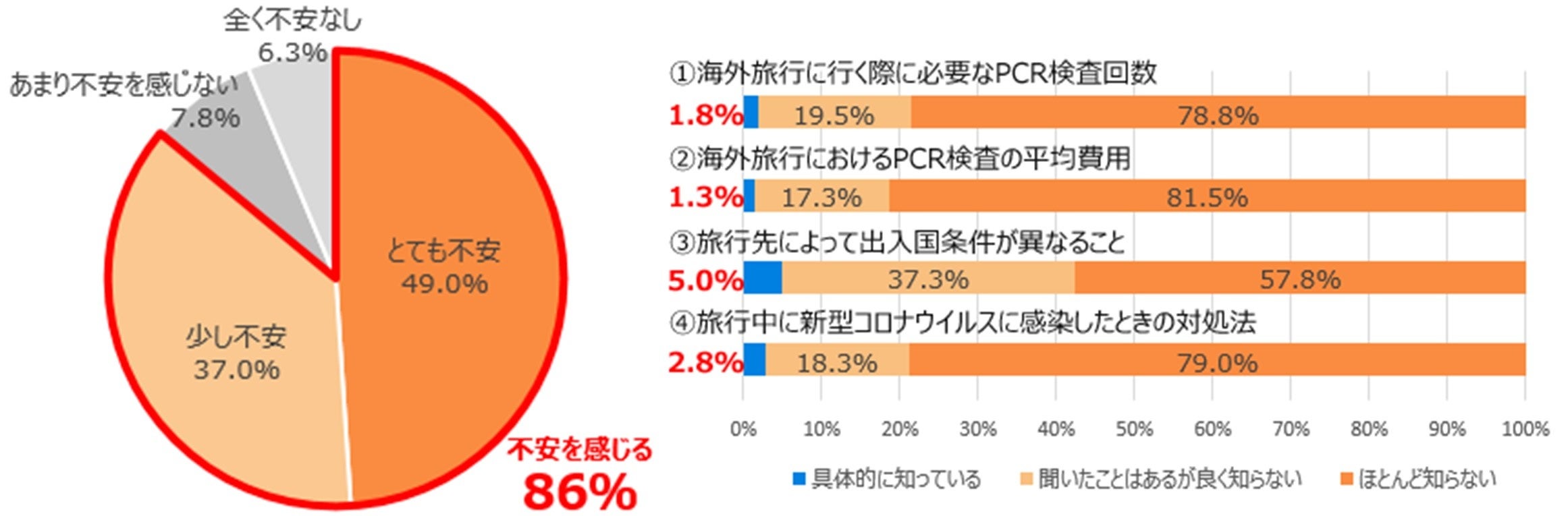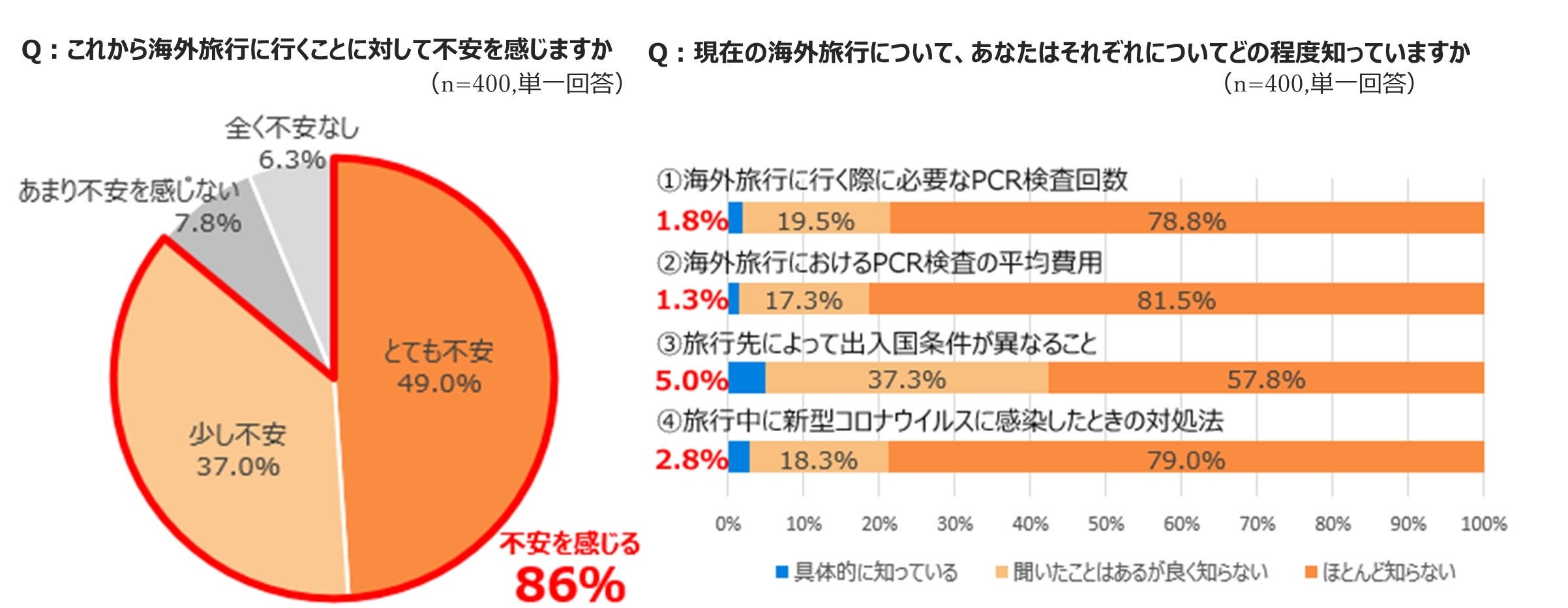 国際的な人の往来の再開に向けた各種措置の開始に伴い、全国の10~70代400名を対象に「コロナ禍における海外旅行に関する意識調査」を実施しました。その結果、海外旅行に対しての不安が浮き彫りとなり、日々変動する渡航条件に旅行者が追いつけていない実態が明らかになりました。