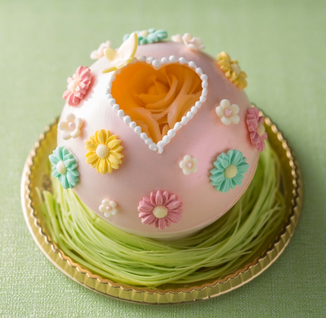 塩漬けをした桜の花びらを生地に練り込み、甘く煮た白エンドウやクランチなどを入れ、クグロフ型*で焼き上げたパウンドケーキです。春をイメージし、チョコレートでかたどった桜の花びらや蝶を飾り付けました。しっとりとしたパウンドケーキの食感と塩気のある味わいをお楽しみください。