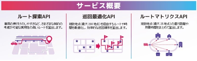 パイオニアが培ってきたルートテクノロジーや位置情報サービスをWeb-API経由で利用できるサービス。日本の道路環境や運行・輸送状況に応じた実用性の高いルート探索、高精度な到着予測時間により、輸配送業務の効率化やコスト削減、輸配送品質の向上など物流関連企業のDX(Digital Transformation)に貢献します。