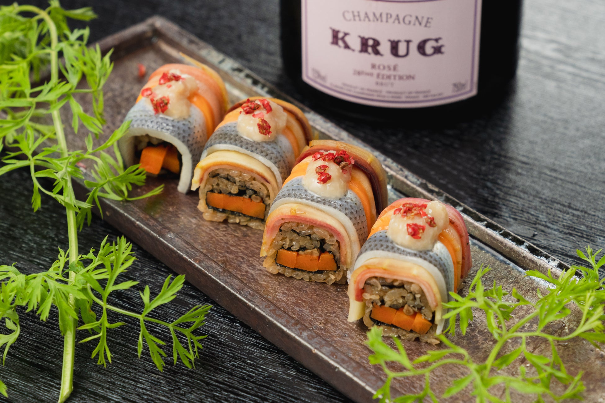 重すぎない柑橘系オレンジのニュアンスに、スミレを思わせるはちみつのタッチの【甘】、そして心地よい熟成香が、クリュッグ ロゼの魅力を形づくっています。料理は、砂糖を使用せず赤酢のみで構成した酢飯による【酸】と、自然由来の発酵を取り入れ、麹を活用することで引き出された【甘】が特徴です。それぞれの【甘】と【酸】のキャラクターが重なり合うことで、シャンパーニュの核となるほのかな熟成香が際立ち、全体の印象に上質な奥行きをもたらします。