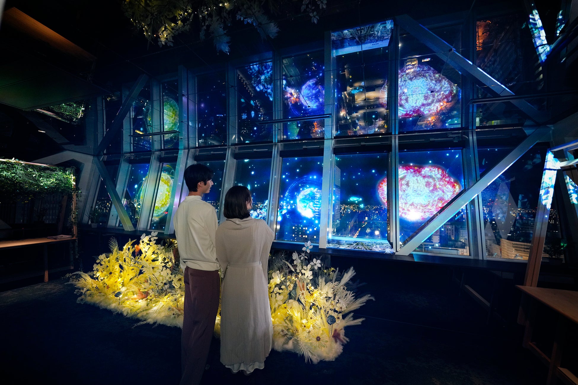 そのほかにも、神聖な冬の夜の始まりを感じさせる幻想的な香りやフラワーテーブル、窓面下の造花花壇装飾などで演出することで、癒しのひとときを過ごせるように。名古屋の観光名所としてだけではなく、名古屋が地元の方々も何度でも足を運びたくなるラウンジ空間になっています。