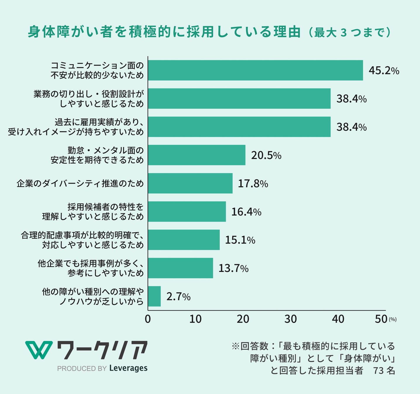 「身体障がい」を積極的に採用している理由としては「コミュニケーション面の不安が比較的少ないため(45.2%)」が最も多く、次いで「業務の切り出し・役割設計がしやすいと感じるため(38.4%)」「過去に身体障がい者の雇用実績があり、受け入れイメージが持ちやすいため(38.4%)」が続きました。身体障がい以外の障がい種別(精神・発達障がい等)に対し、受け入れノウハウの不足を抱えている可能性を示唆しています。