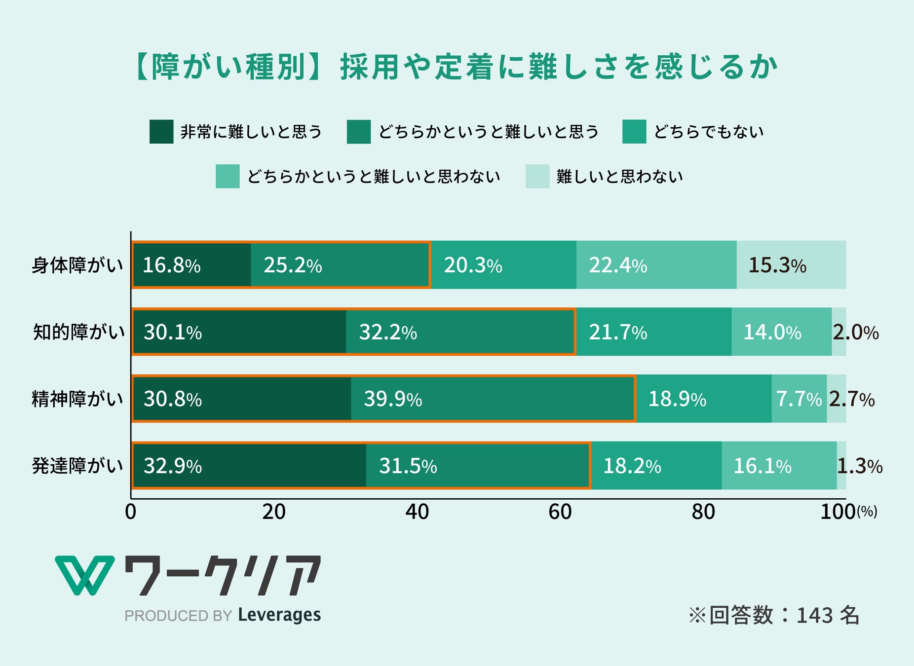 レバレジーズ株式会社が運営する障がい者就労支援サービス「ワークリア」( https://worklear.jp/)は2026年7月の法定雇用率引き上げに先駆け、障がい者雇用の担当者143名を対象に、障がい者の採用実態調査を実施しました。