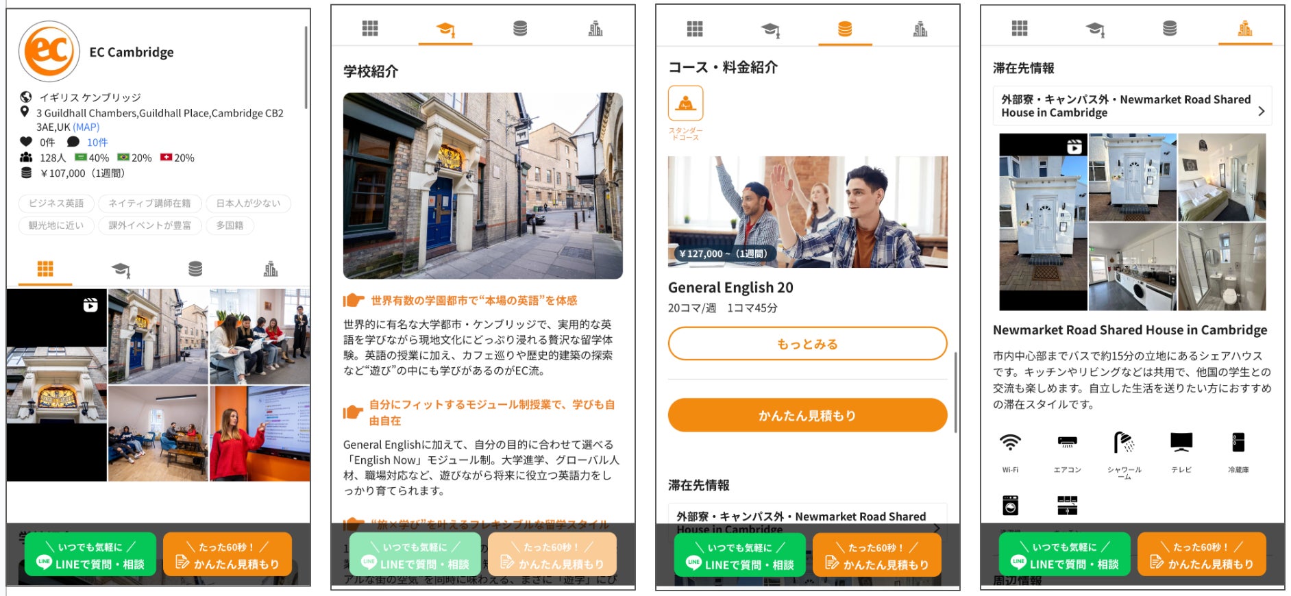 ネイティブキャンプ留学では、ユーザーが必要な情報を分かりやすく把握できるよう、常に丁寧で明確な情報提供を心がけています。EC Cambridgeの詳細情報は、以下の4つのカテゴリーに分けて掲載しており、知りたい情報を的確にお届けします。