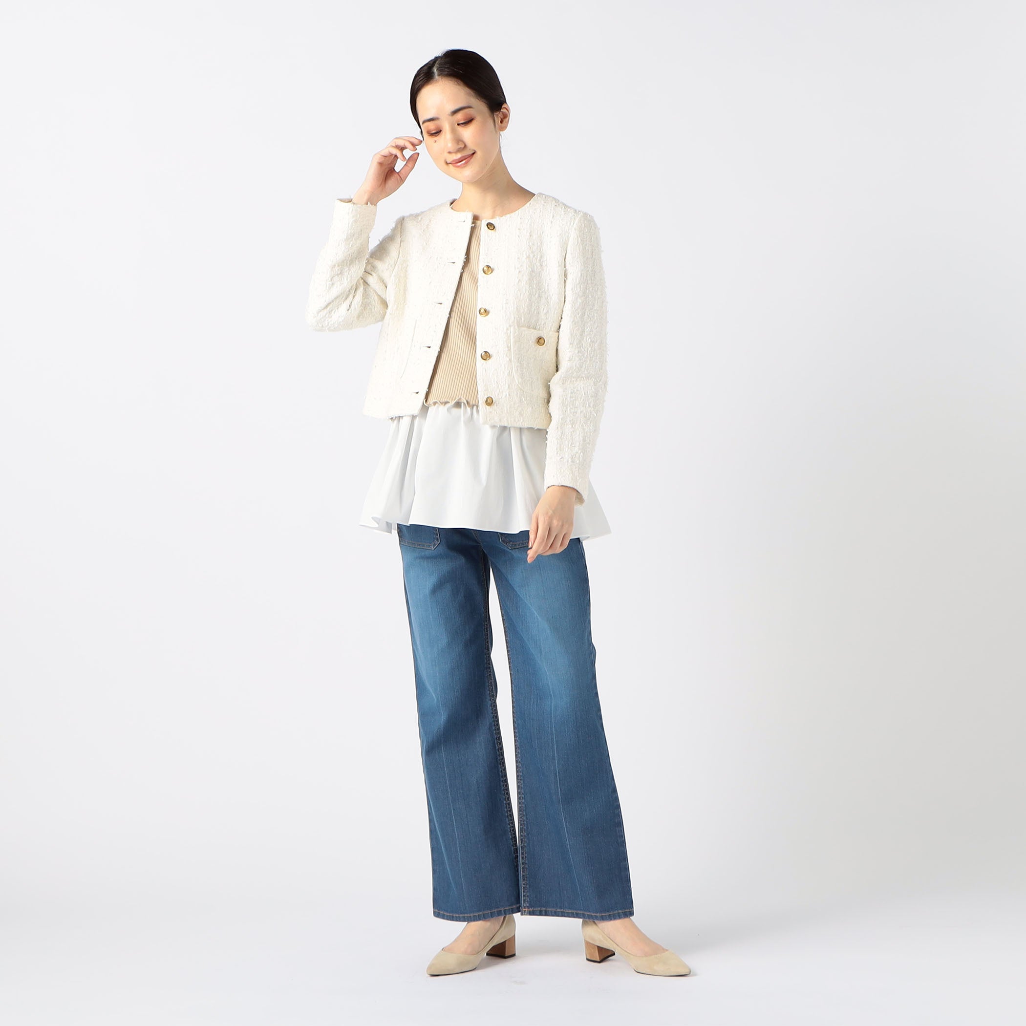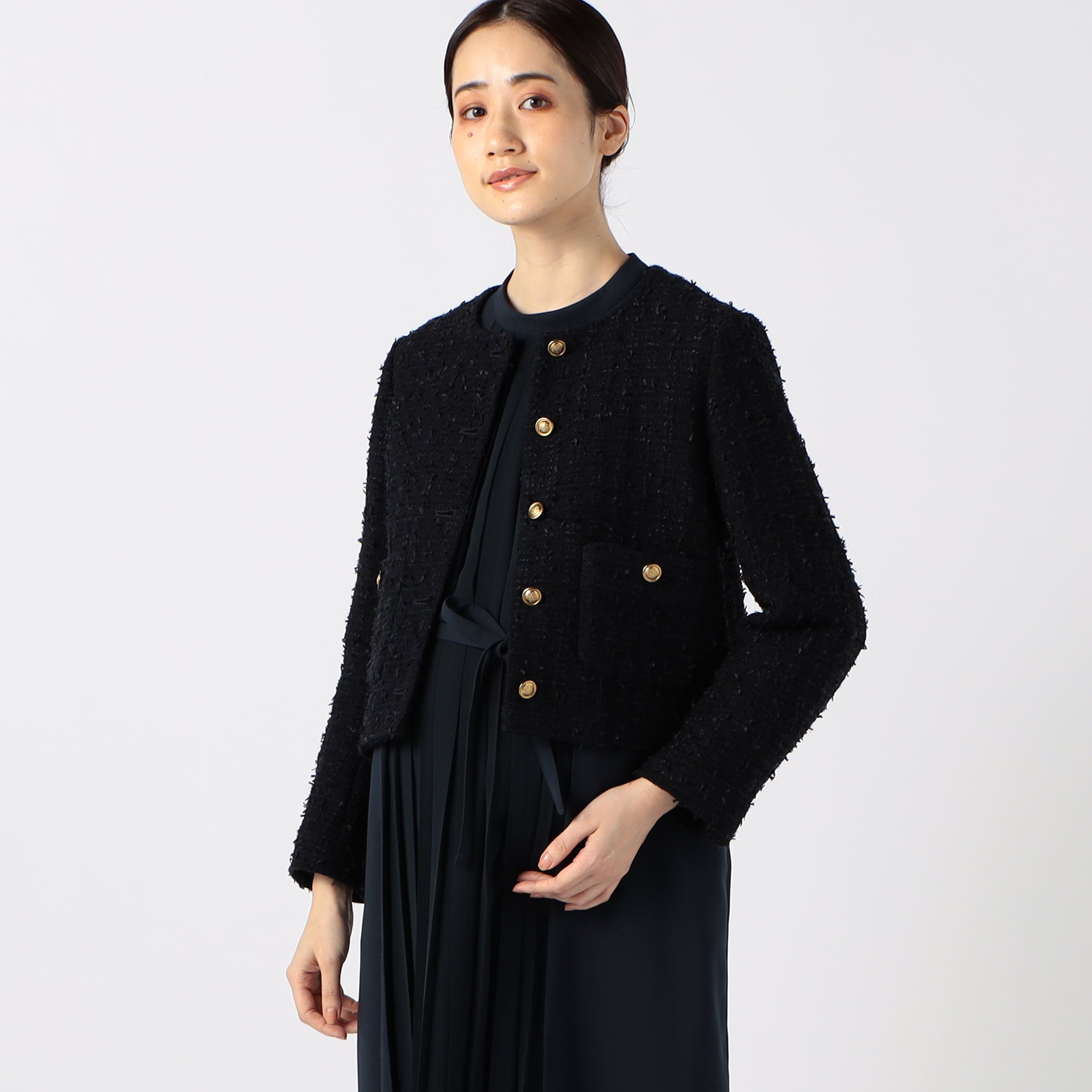 デイリーもフォーマルにも活躍!産前産後も着られるコムサ・ブロンドオフのツイードジャケット