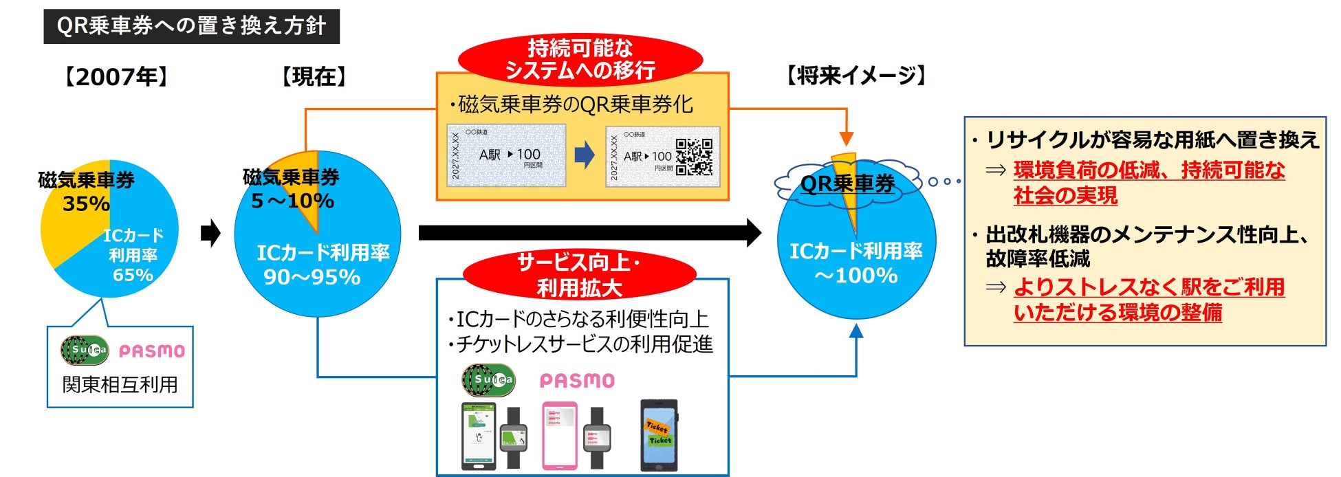 ○京成電鉄株式会社、京浜急行電鉄株式会社、新京成電鉄株式会社、西武鉄道株式会社、東京モノレール株式会社、東武鉄道株式会社、東日本旅客鉄道株式会社、北総鉄道株式会社(以下、「鉄道8社」)は、磁気乗車券からQRコードを使用した乗車券(以下、QR乗車券)への置き換えを2026年度末以降、 順次実施します。 ○鉄道の乗車券については、シームレスにご利用いただけるSuica・PASMOの交通系ICカードや、各社のチケットレスサービスを主体とし、引き続きサービス向上と利用拡大を継続していきます。一方で、磁気乗車券をQR乗車券へ置き換えることで、鉄道サービスの持続的な提供を実現していきます。 |