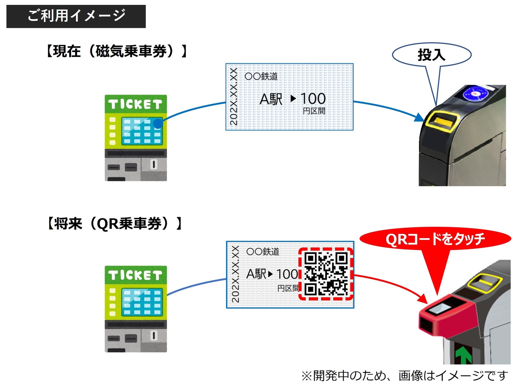 磁気乗車券を出改札機器へ投入する方式から、QR乗車券のQRコードを出改札機器のQRリーダーにタッチする方式へ変更します。