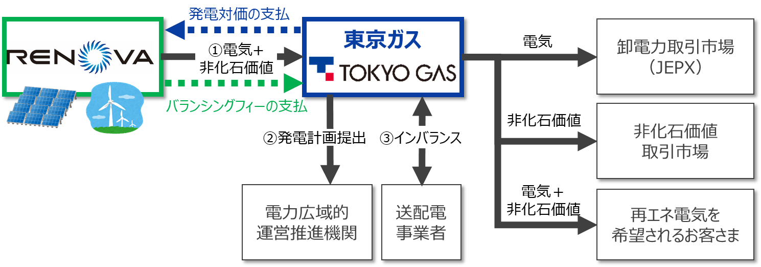 東京ガス株式会社(社長:内田 高史、以下「東京ガス」)は、このたび、株式会社レノバ(社長:木南 陽介、以下「レノバ」)との再エネ需給調整サービス(*1)を活用した電力購入契約(*2)(以下「本契約」)に基づき、太陽光発電の電力と非化石価値の買取を開始しました。
