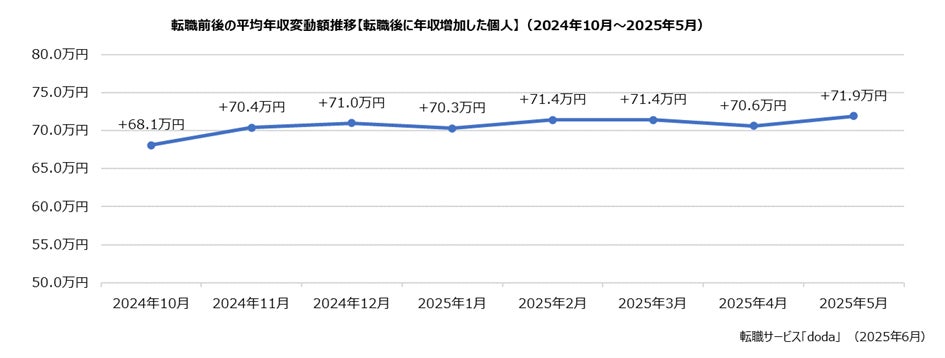 パーソルキャリア株式会社が運営する転職サービス「doda(デューダ)」(編集長:桜井 貴史)は、dodaエージェントサービスを利用して2025年5月に転職決定した個人の、転職前後の平均年収変動額と年収変動割合を発表いたします。
