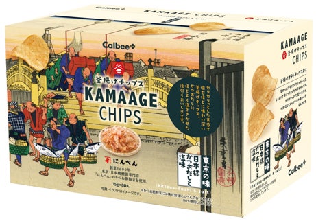 「釜揚げチップス」は、厚切りにスライスしたジャガイモをじっくり丁寧にフライすることで、カリカリっとした堅い食感と噛むほどにジャガイモの味わいを楽しめるポテトチップスです。多くの人に好まれ、お子様にも食べやすく、飽きのこないおいしさのかつおだしが味のベースです。にんべんの鰹節粉末(※)を使用し、だしのまろやかな旨味を引き立たせるよう、程よく塩をきかせました。かつおだしの香りのよさと味わいにこだわり、にんべんとの共同開発を重ねた自信作です。パッケージは当時の日本橋の活気ある雰囲気と伝統を感じさせる東海道五十三次の浮世絵をモチーフにし、魚売りの桶に鰹のイラストを入れることで商品との親和性を演出しました。※鰹節粉末には、にんべんの鰹節を100%使用しています。